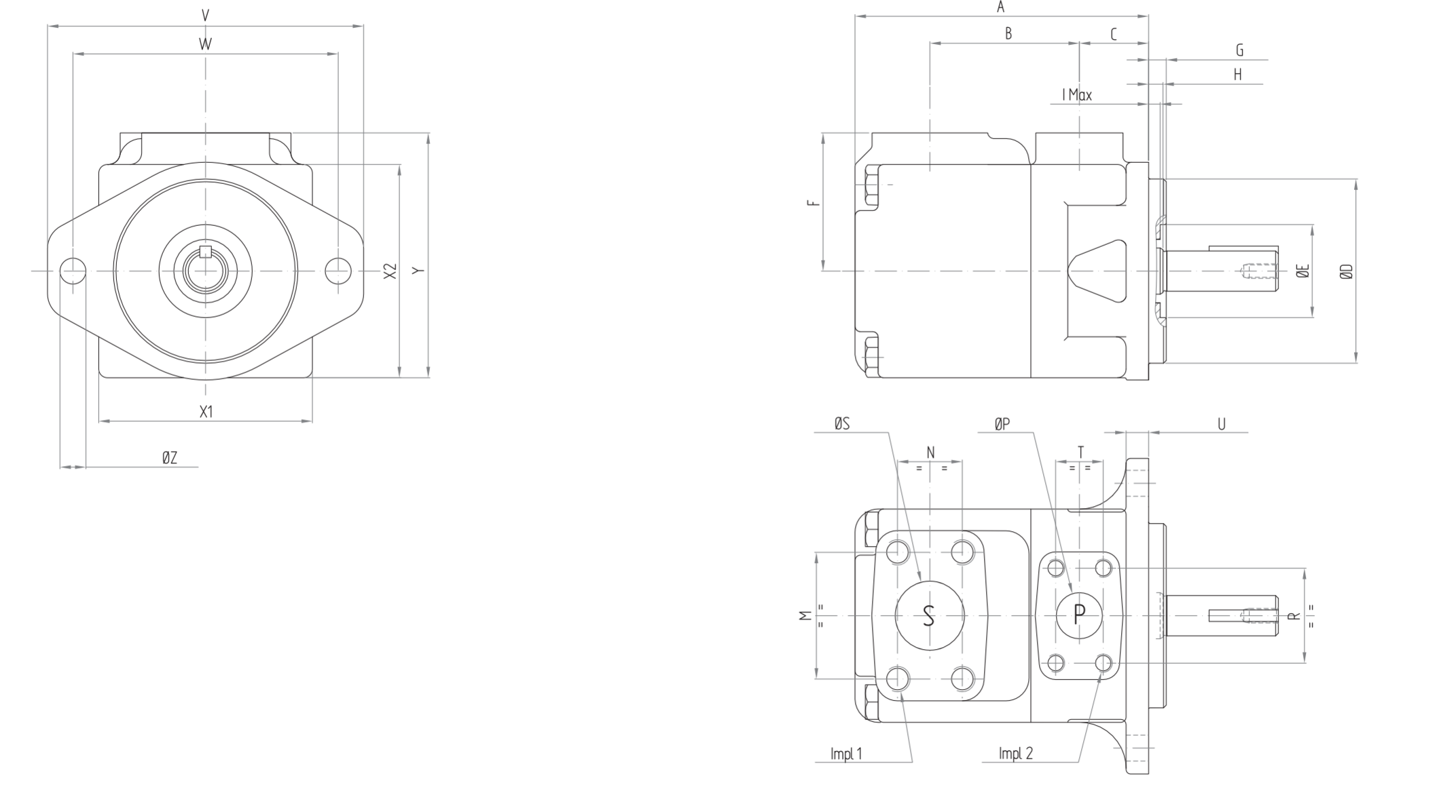 | M mm (in) | N mm (in) | R mm (in) | T mm (in); | ØS mm (in) | ØP mm (in) | U mm (in) | Impl 1 | Impl 2 |