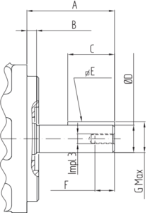 | A mm (in) | B mm (in) | C mm (in) | D mm (in) | E mm (in) | F mm (in) | G Max mm (in) | Impl 3 |