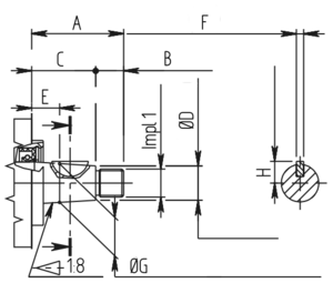 | A mm (in) | B mm (in) | C mm (in) | ØD mm (in) | E mm (in) | F mm (in) | ØG mm (in) | H mm (in) | Impl 1 |
